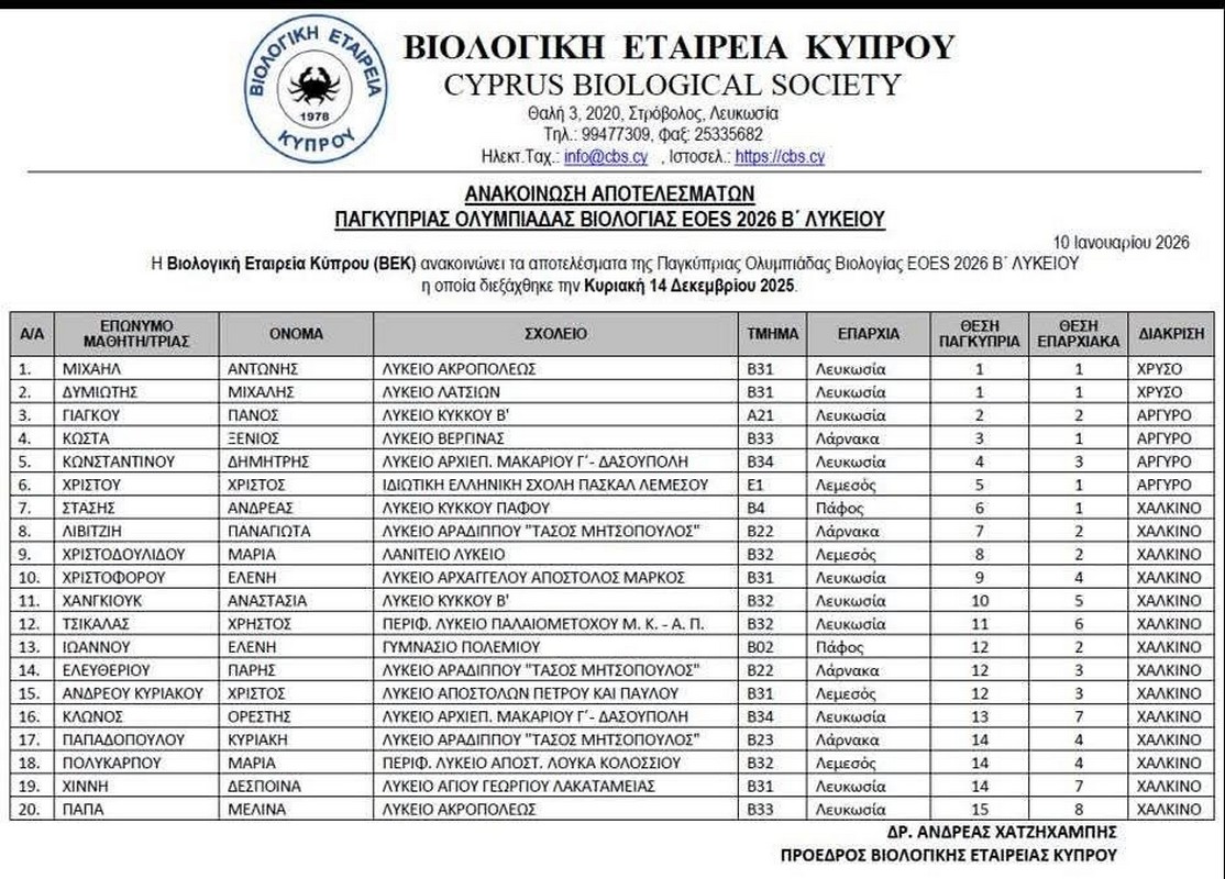 Η Βιολογική Εταιρεία Κύπρου ανακοίνωσε τα αποτελέσματα της Παγκύπριας Ολυμπιάδας Βιολογίας B΄ ΛΥΚΕΙΟΥ EOES 2026 η οποία διεξήχθη την Κυριακή 14 Δεκεμβρίου 2025.